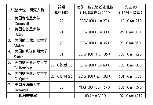 比較乳寶80與噴霧干甜乳清粉、結(jié)晶乳糖對(duì)仔豬增重率的影響。