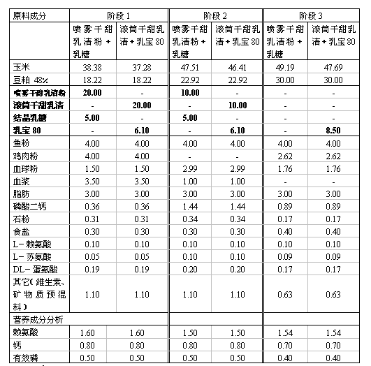 3個階段都使用以典型飼糧配方為基礎(chǔ)的飼糧,只將乳糖原料做一定調(diào)整(見下表)。記錄每階段結(jié)束時動物的體重和采食量。